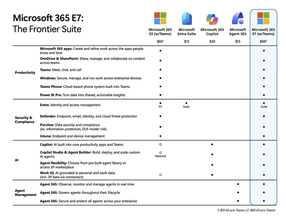 La licenza Microsoft 365 E7 è un livello aziendale pensato per le organizzazioni che adottano funzionalità avanzate di intelligenza artificiale all'interno dell'ecosistema Microsoft. Come parte di Microsoft 365 E7: The Frontier Suite, combina le funzionalità di produttività, conformità e sicurezza della licenza Microsoft 365 E5 con Teams Phone di livello aziendale, le conferenze audio e il supporto Microsoft basato sull'intelligenza artificiale per l'IA, offrendo una piattaforma unificata per la collaborazione, la comunicazione, la gestione delle identità e la governance.
